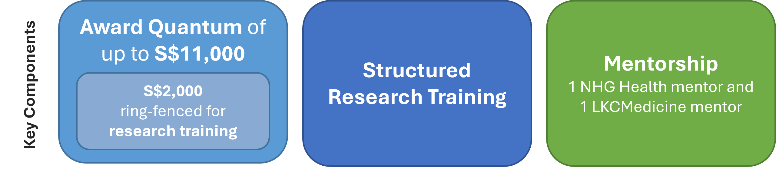 Each applicant is required to nominate a mentor from NHG Health and a mentor from LKCMedicine (subject to approval by the review committee) to guide them in their research project. They should approach and discuss the details of the project with their nominated mentors.